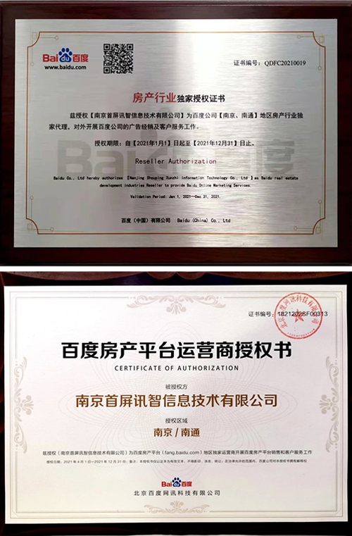 會(huì)上,百度公司正式授權(quán)南京首屏訊智信息技術(shù)有限公司為南京、南通地區(qū)房產(chǎn)行業(yè)獨(dú)家代理商及百度房產(chǎn)平臺(tái)南京、南通地區(qū)獨(dú)家運(yùn)營(yíng)商,并頒發(fā)授權(quán)證書。首屏訊智自2004年成為百度合作伙伴,始終致力于為廣大企業(yè)提供優(yōu)質(zhì)的互聯(lián)網(wǎng)營(yíng)銷服務(wù)。擁有17年豐富互聯(lián)網(wǎng)行業(yè)服務(wù)經(jīng)驗(yàn)的首屏訊智,已服務(wù)南京企業(yè)2萬余家,助力廣大企業(yè)快速穩(wěn)健發(fā)展。